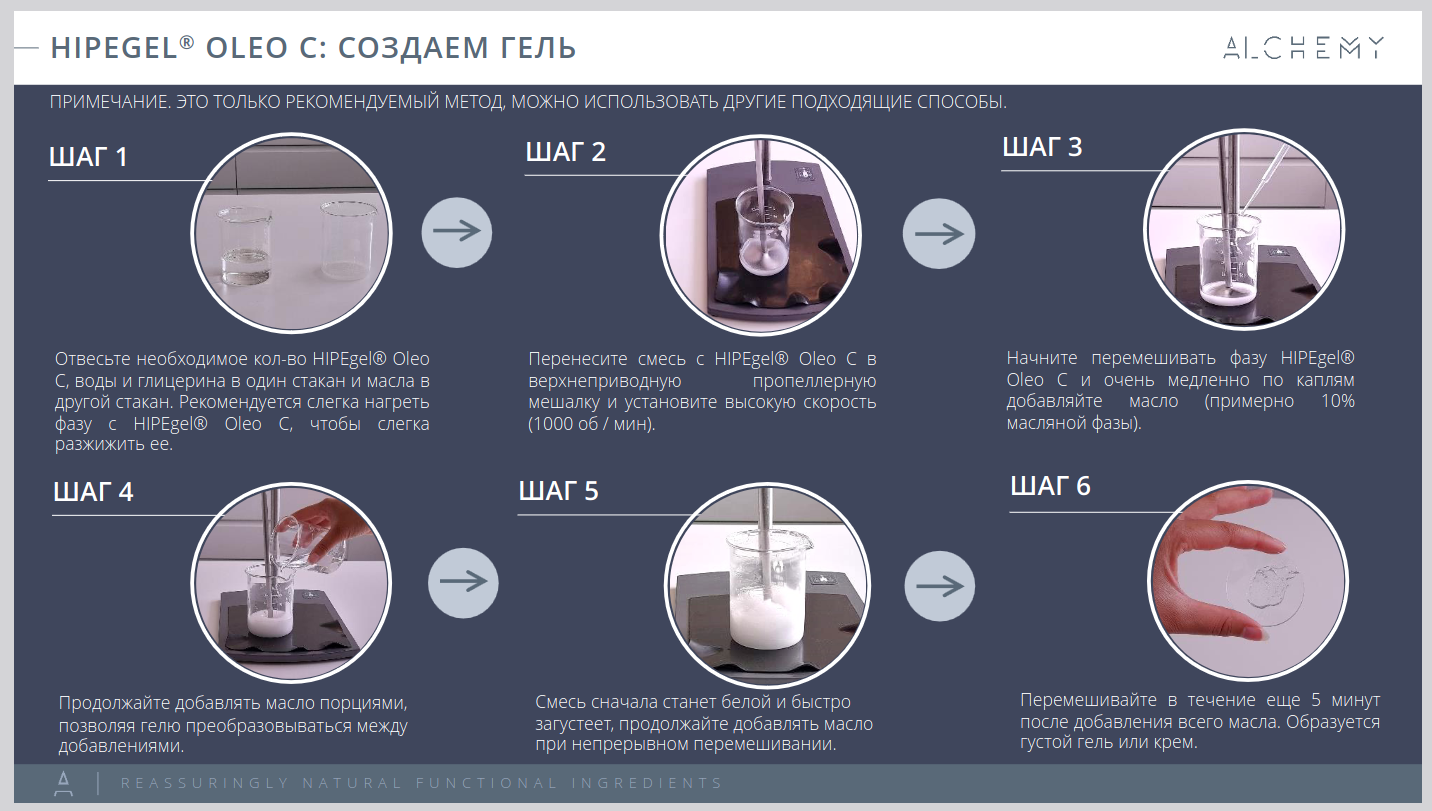 Гели на основе HIPEgel Oleo C по сравнению с рецептурами на Sucragel дают лучшее скольжение и приятную сенсорику. HIPEgel Oleo C позволяет создавать масляные гели с концентрацией масляной фазы 80-90%,обладающие уникальными легкими ощущениями на коже и "quick-break" эффектом (при нанесении на кожу гель превращается в масло, при добавлении воды — в эмульсию). Совместим со всеми типами масел, кроме высокополярных.
