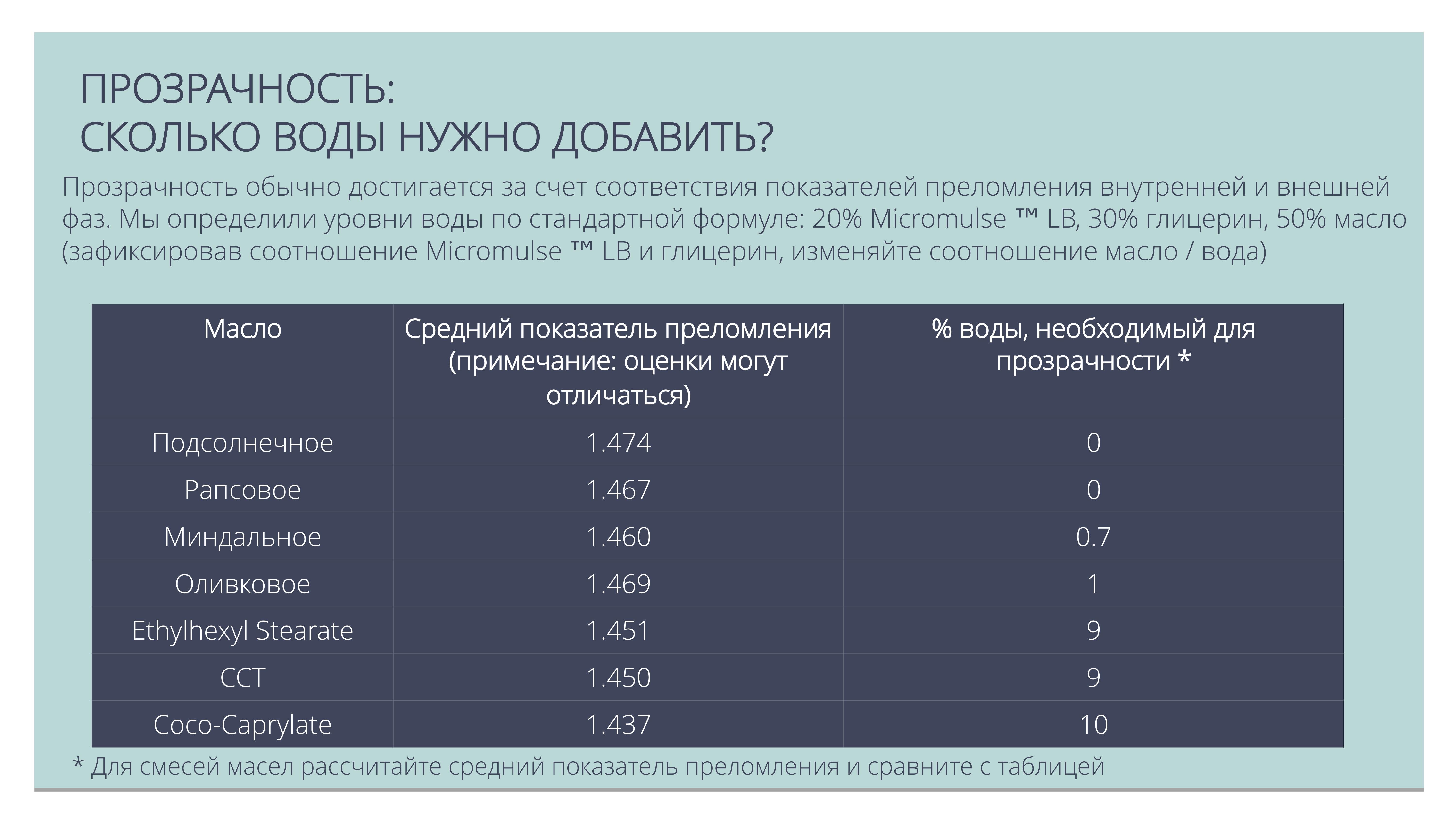 Позволяет создавать ультра актуальные прозрачные мицеллярные масла для очищения кожи и снятия макияжа, продукты для купания («молочные ванны»), гидрофильные масла для душа.